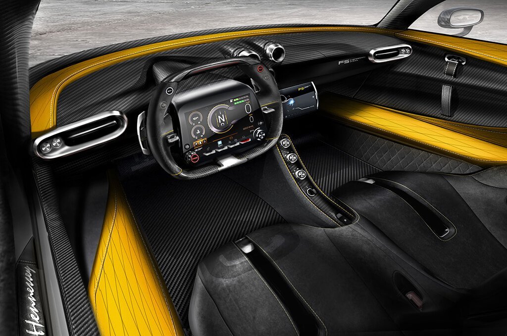 The car features a simple cockpit and a steering wheel which is similar to F1 racing cars. The steering wheel has many switches and button, as well as a glass screen. There is a dashboard LCD for gauges and in the interior the material used is carbon fiber.